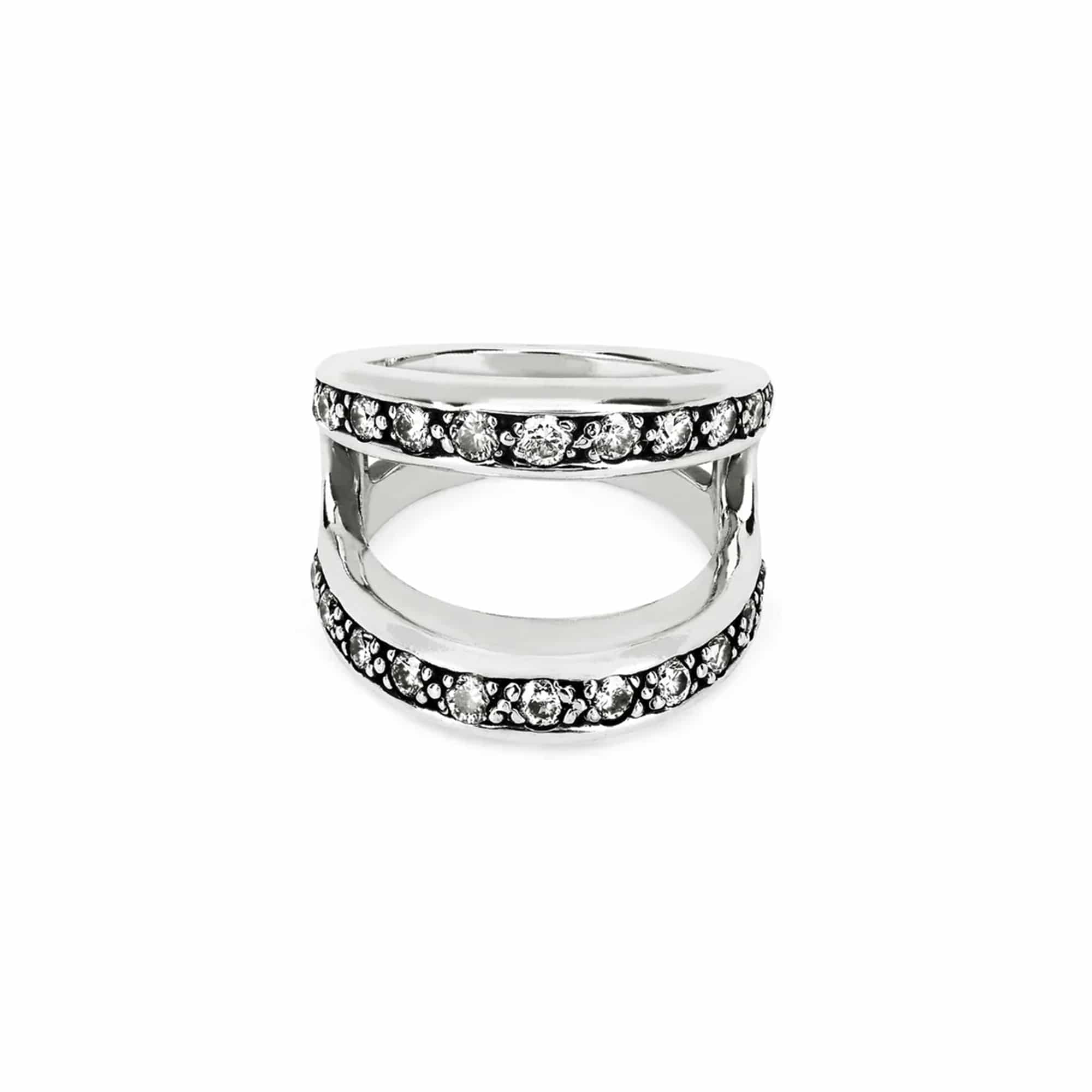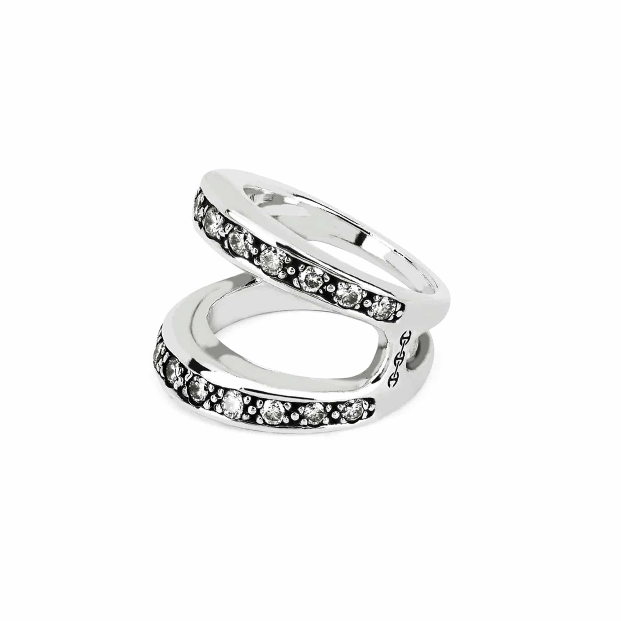 間隔を開けた、二つのバンドが象徴的なリング。リングの側面にはTRI-LINKモチーフの刻印が施されています。全面にあしらわれたダイヤモンドが高級感を醸します。素材はSilver 925。