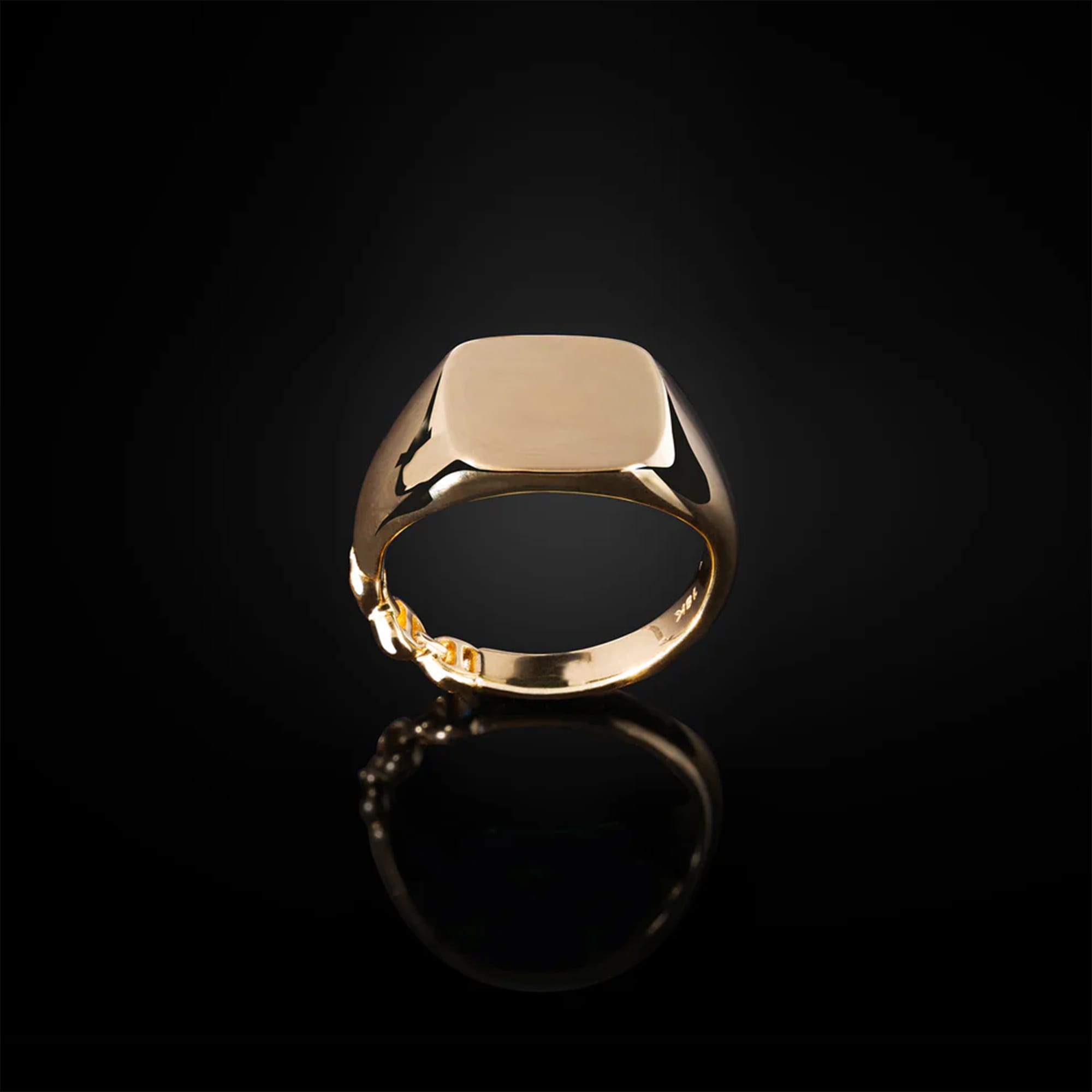 長方形フォルムのシグネットリング。バンド部分にTRI-LINKモチーフを施しています。素材は18K GOLD。